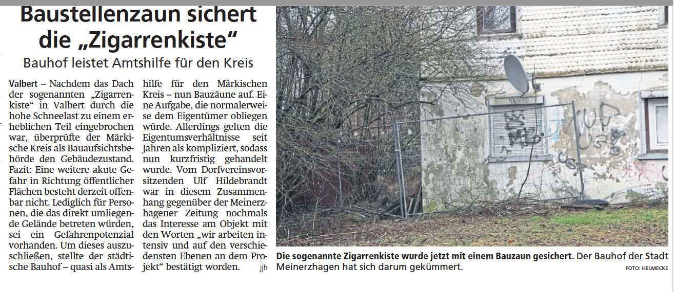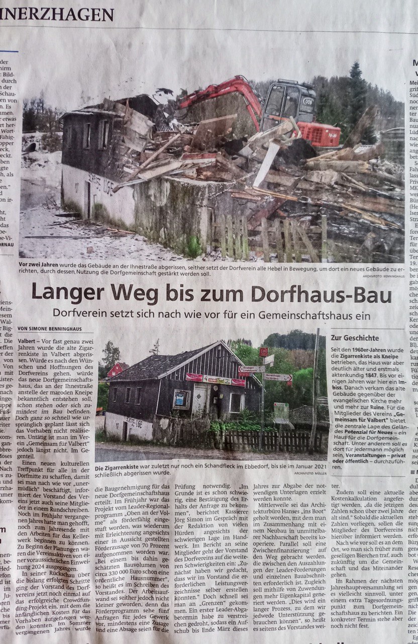 Wir haben die Zigarrenkiste erworben und das für einen sehr geringen Betrag. Es war ein langer und holpriger Weg, aber jetzt können wir unser eigenes Vereinshaus planen.“ BeimTagesordnungspunkt „Aktueller Sachstand und Ausblick“ verkündete Ulf Hildebrandt den Mitgliedern des Vereins Gemeinsam für Valbert bei der Jahreshauptversammlung in der Hültekanne diese gute Nachricht. Durch die Bemühungen einer Anwaltskanzlei im Zusammenspiel mit einem Valberter Privatmann konnte endlich die verworrene Eigentumsproblematik der Ruine an der Ihnestraße geklärt werden, und durch einen Flächentausch des Dorfvereins mit der Stadt Meinerzhagen ist das dazu gehörende Grundstück nun rund 400 Quadratmeter groß. „Das ist für unseren Verein ein enormer Immobilienwert,“ so Hildebrandt, der sich auch mit Blick auf die Finanzierung der Sanierung des rund 70 Quadratmeter großen eineinhalbgeschossigen Gebäudes optimistisch zeigte. Aufgrund eines jetzt zu erstellenden Kosten-Nutzen-Planes könnten Fördergelder des Landes beantragt werden, und auch die Stadt habe bereits ihre Unterstützung zugesagt. Viele Arbeiten seien auch in Eigenleistung zu stemmen.