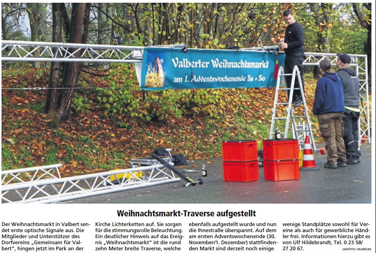 Der Weihnachtsmarkt in Valbert sendet erste optische Signale aus. Die Mitglieder und Unterstützer des Dorfvereins „Gemeinsam für Valbert“, hingen jetzt im Park an der Kirche Lichterketten auf. Sie sorgen für die stimmungsvolle Beleuchtung.
