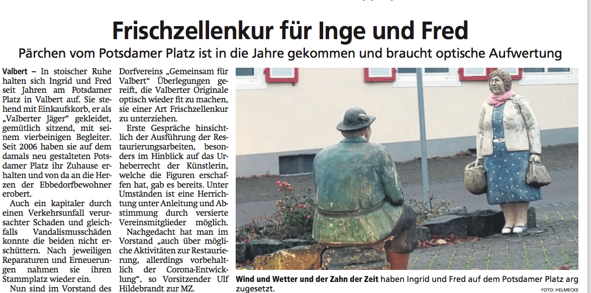Nachdem die Valberter Figuren ( Inge, Fred und Waldi ) im letzten Jahr nach einer aufwendigen Aufarbeitung mit einem kleinen Fest wieder an ihrem angestammten Platz installiert worden waren, mussten sie schon nach kurzer Zeit wieder abgebaut werden, weil eine Baufirma sie massiv beschädigt hat.