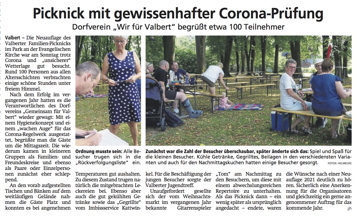 Bei strahlendem Sommerwetter trafen sich die Valberter im Kirchpark und genossen das Picknick, bei selbst mitgebrachtem Essen, leckeren Würstchen vom Grill und kühlen Getränken, sichtlich.